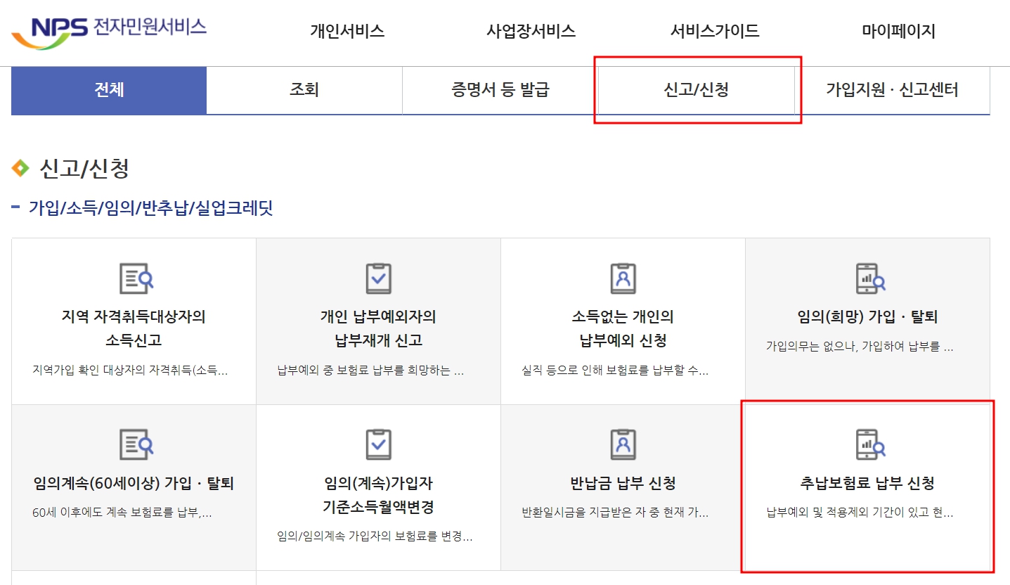 4) [신고/신청]을 클릭하신 후 [추납보험료 납부신청]을 클릭하여 접속해주시기 바랍니다.
